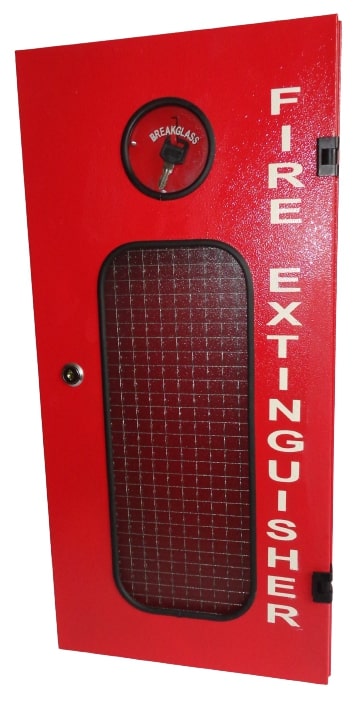 Kulccsal zárható tűzoltó készülék tároló szekrény dróthálós biztonsági üveggel, vészkulcs tárolóval.